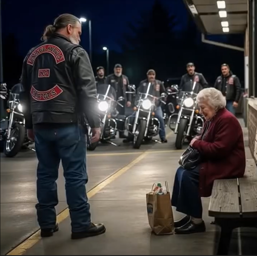 Just then, the sound of engines broke the silence. A group of bikers pulled into the parking lot. They were members of a motorcycle club—Savage Angels MC—with leather jackets and tough expressions that might have made others turn away. But one of them, a large man with a beard and kind eyes, noticed Margaret sitting alone. He walked over slowly and knelt beside her.